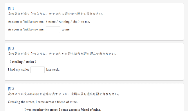 さまざまな形式の演習問題で、分詞・分詞構文のルールが定着しているかを確認します。