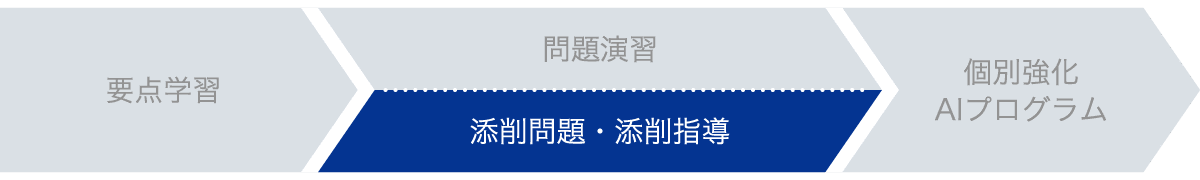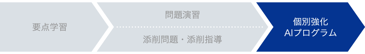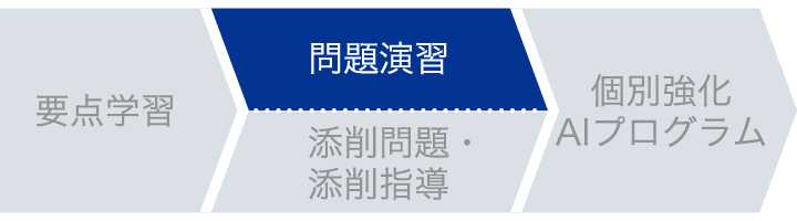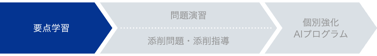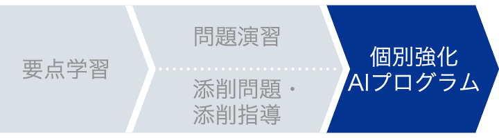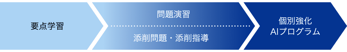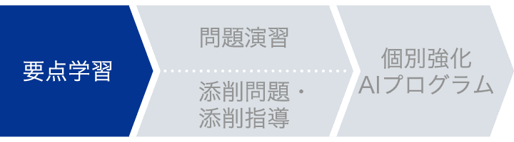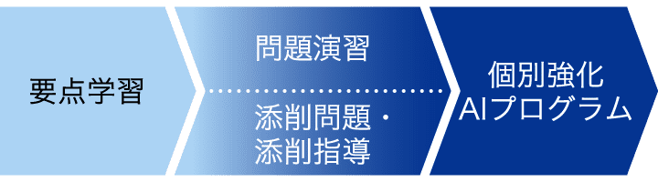 中高一貫コースでは、要点学習→問題演習・添削問題・添削指導→個別強化AIプログラム、の流れで単元を学び、定着させます。