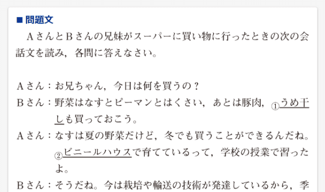 入試や模擬試験でよく出題される会話文形式の問題も登場します。