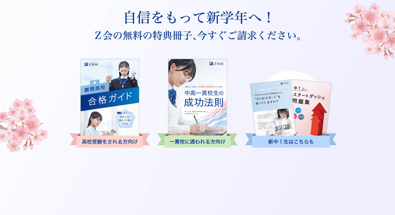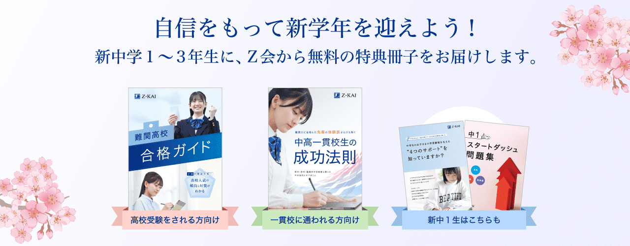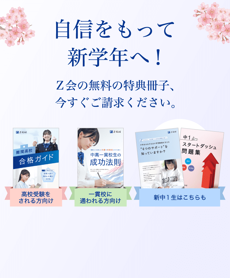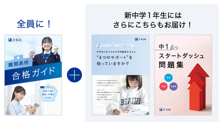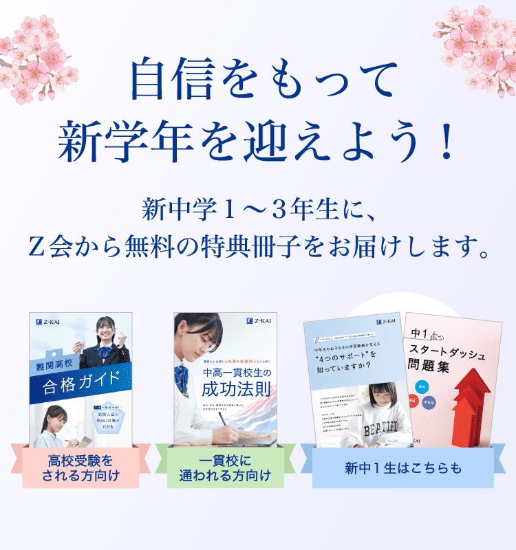 - ※Z会の会員の方は、『難関高校合格ガイド』『中高一貫校生の先輩の成功法則』『中1スタートダッシュ問題集』をZ会学習アプリのお知らせに配信いたします。アプリからご覧いただけますので、こちらでご請求いただく必要はありません。