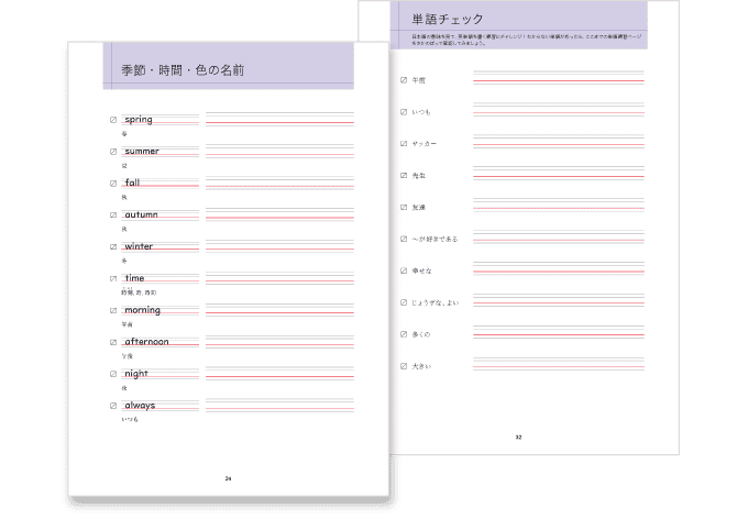 よく使う英単語を完ぺきに書けるよう練習できる構成。練習した後は、「単語チェック」で定着を確認できるから安心です。