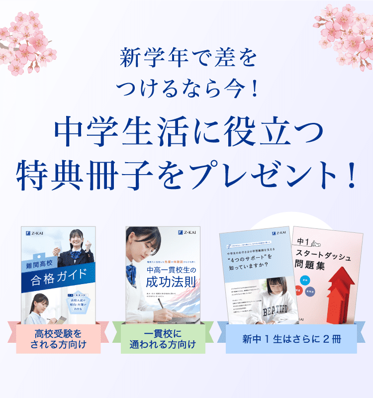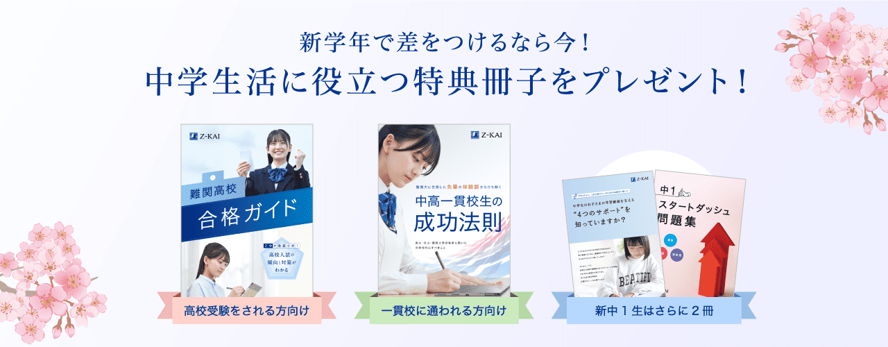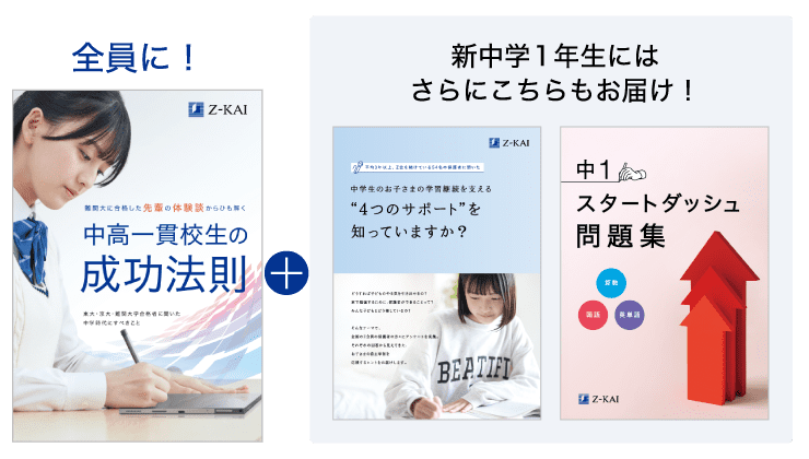 - ※Z会の会員の方は、『難関高校合格ガイド』『中高一貫校生の先輩の成功法則』『中1スタートダッシュ問題集』をZ会学習アプリのお知らせに配信いたします。アプリからご覧いただけますので、こちらでご請求いただく必要はありません。