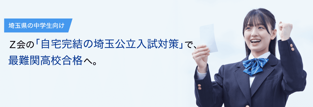 | 学校選択問題採用校 | 浦和高校(県立)/浦和第一女子高校/浦和西高校/大宮高校/春日部高校/川口北高校/川越高校(県立)/川越女子高校/川越南高校/熊谷高校/熊谷女子高校/熊谷西高校/越ケ谷高校/越谷北高校/所沢高校/所沢北高校/不動岡高校/和光国際高校/蕨高校/さいたま市立浦和高校/さいたま市立大宮北高校/川口市立高校 |