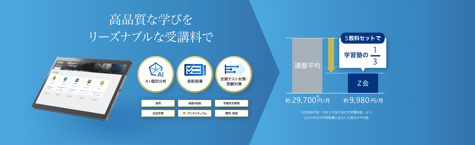 ※1:「12カ月一括払いまたは6カ月一括払い」の受講内容で「Z会専用タブレット」をお申し込みいただくと、44,600円の値引きの適用により、「Z会専用タブレット」を0円でご購入いただけます。