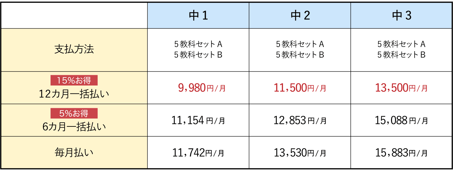 ※支払方法は12カ月一括払い、6カ月一括払い、毎月払いの場合も上記料金となります。