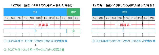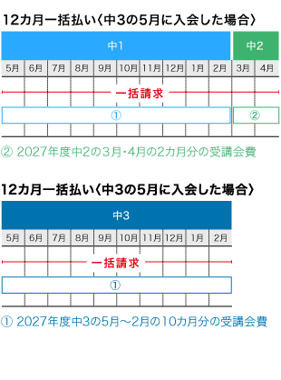 中3の2月までの期間において一括払いの月数に満たない場合は、受講月数の会費を一括してご請求します。