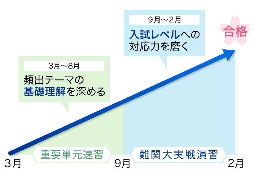 頻出テーマ・形式を厳選。専用カリキュラムで理解を深めながら、入試レベルへ段階的に引き上げます。