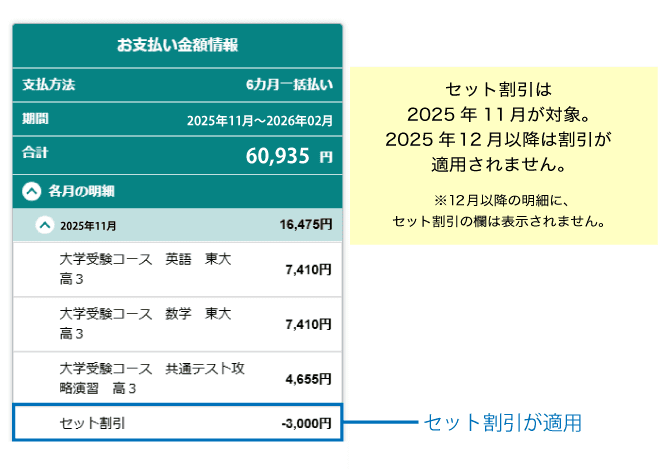 「2講座以上」かつ「6カ月一括払い」(学年末までの一括払い)にてご受講いただくと、0円でご購入いただけますが、共通テスト攻略演習を含む2講座受講の場合には、本講座が11月までの開講となるため、12月~2月会費については割引が適用されずお支払いが発生します。