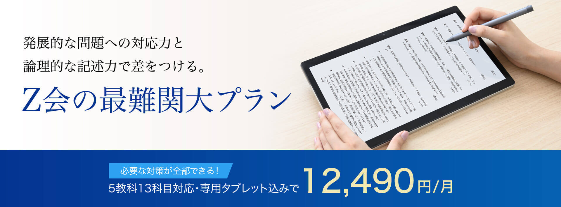 月額12,490円は、Z会専用タブレットを購入し、「最難関大プラン」を12カ月一括払いで受講した場合の税込料金。