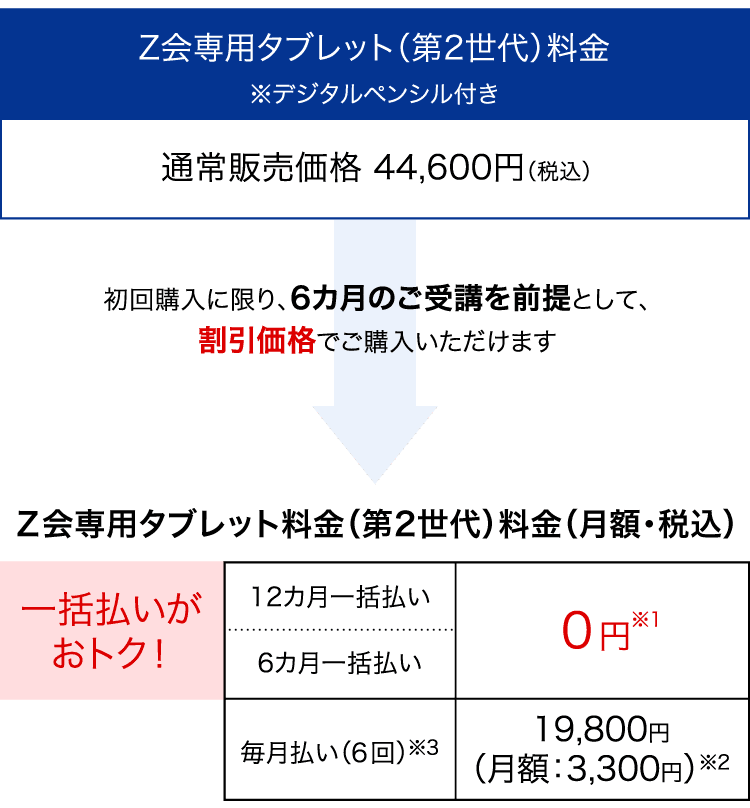 ※1 「2講座以上」かつ「6カ月一括払い」の受講内容で「Z会専用タブレット」をお申し込みいただくと、44,600円の値引きの適用により、「Z会専用タブレット」を0円でご購入いただけます。