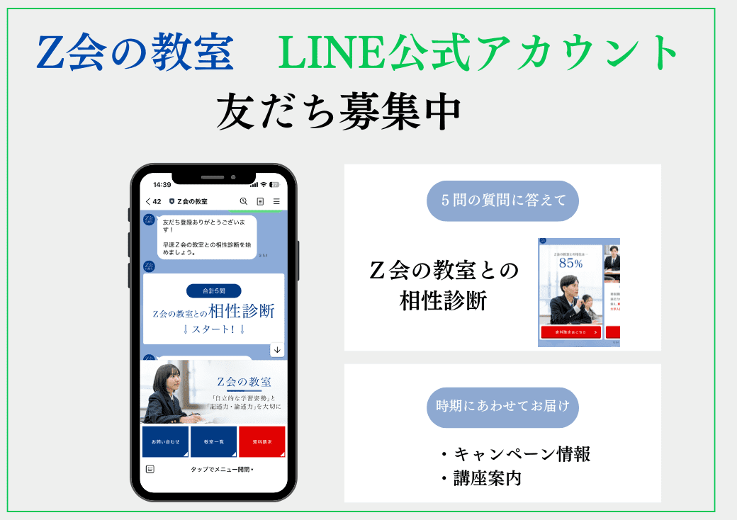 Z会の教室 公式LINEアカウント Z会の教室 公式LINEアカウント 難関校受験なら、Z会の教室 1985年の創立以来、単なる「得点力」を超えた「自ら考え、表現する力」を養い、多くの合格実績を築いてきました。私たちの願いは、合格の先にある成長です。受験を通じて、将来社会で活躍できる豊かな人間性を育みます。 5つの質問で、Z会の教室と相性診断ができます。 おトクな情報や時期に応じたご案内も届きますので、ぜひご登録ください。