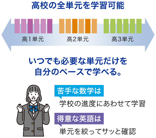 ※高2の間は、英数国のみ添削指導付き。理科・地歴は、AI演習(個別強化演習)に取り組み、知識の定着をはかります。高3からは、理科・地歴にも添削指導が付きます。