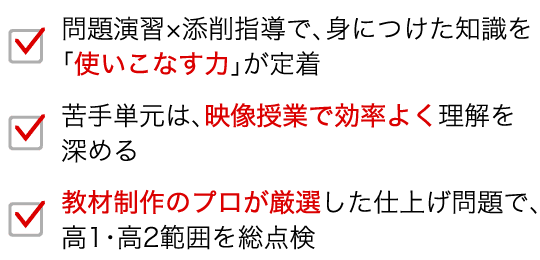 実戦演習を中心に志望大の対策を強化。添削指導で答案の改善点がわかる。