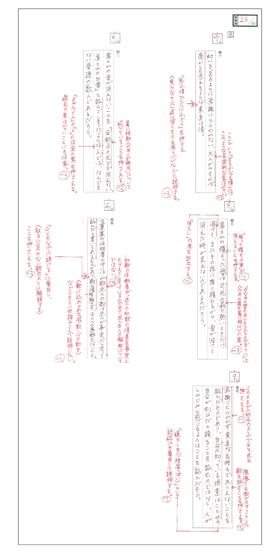 Z会で作成した採点基準をもとに再現答案を採点してみると、合格者平均と不合格者平均で概ね8点程度の差がつく結果となりました。「みな月の望」というキーワードを正確に押さえられているかどうかで問題文の理解が変わってくるため、そこで大きく差がついてしまったようです。問四では、「筆者は(万葉集の注釈書に対し)何を問題視しているのか」をとらえるために、まず傍線部を正確に逐語訳したうえでポイントを整理していく必要がありますが、丁寧に解釈できているものとそうでないものの差が見られました。全体として、