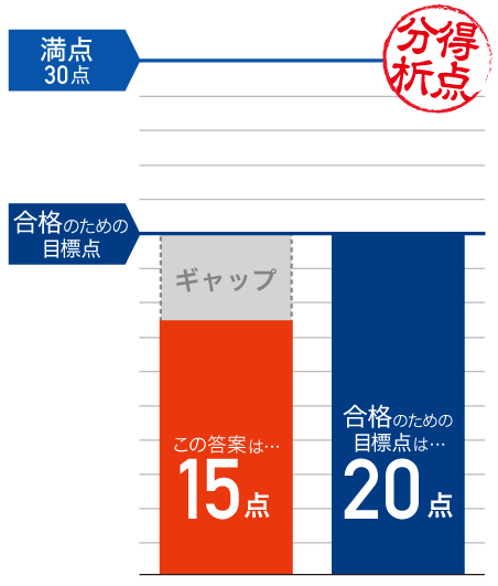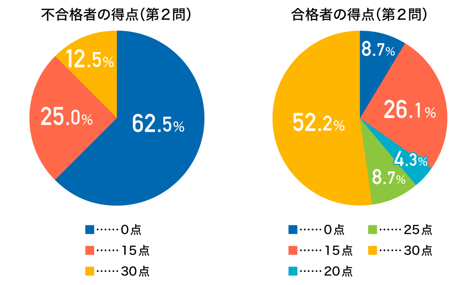 グラフに示したとおり、不合格者の大半は15点以下で、合格者の大半は15点以上となっています。つまり、この問題の不合格者と合格者の得点差は非常に大きいということです。