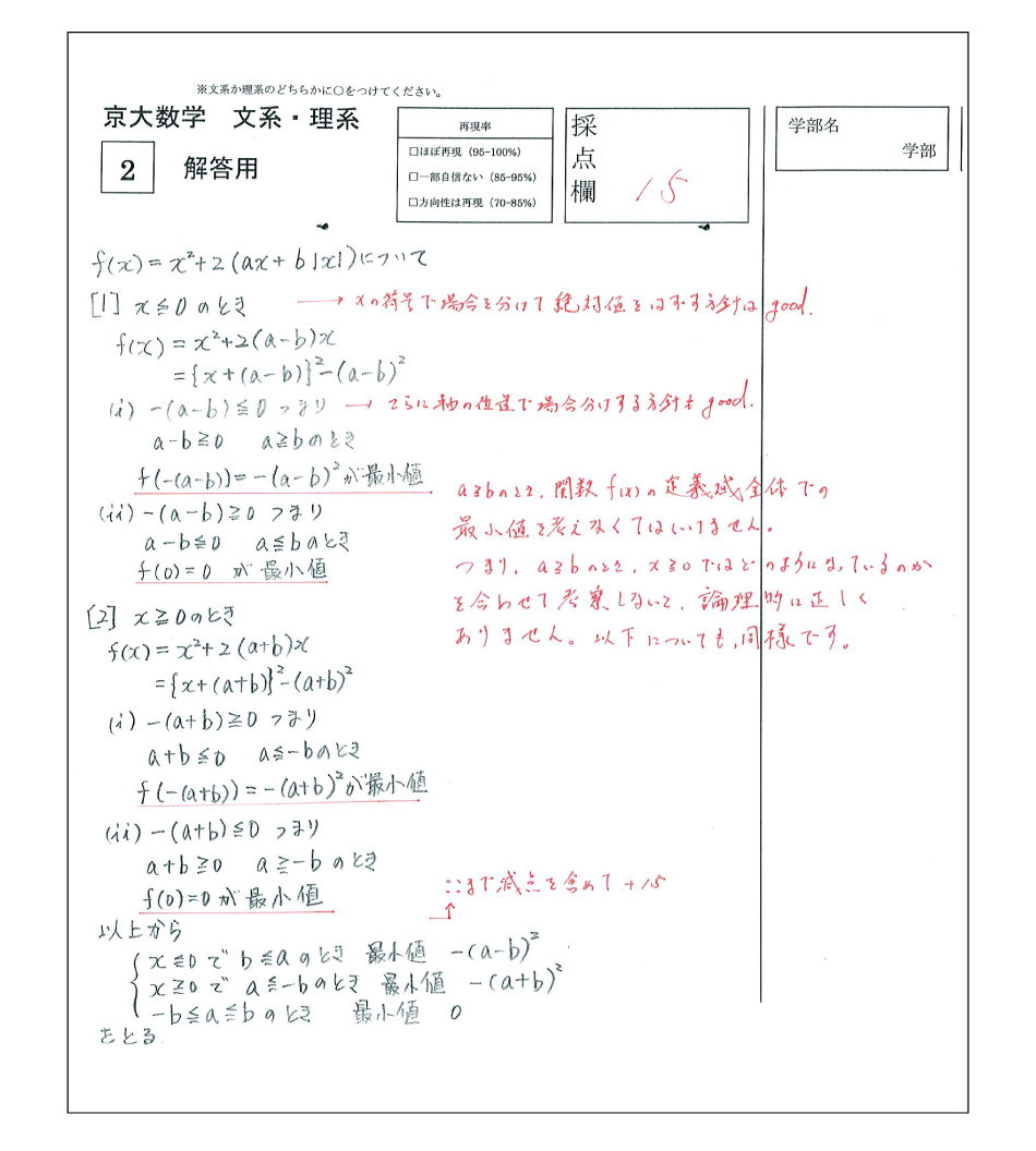 以下の答案は、実際に入試を受験したZ会員の先輩がつくってくれた再現答案です。目標点(合格ライン)には達していません…。