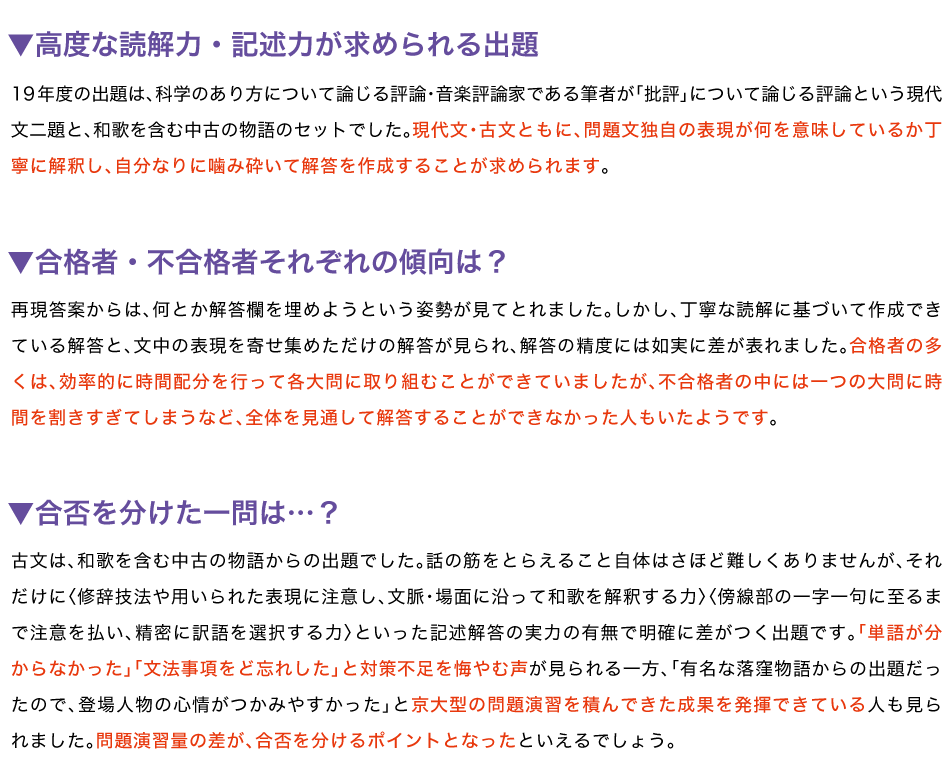 和歌を含む平安時代の物語からの出題であるが、問題文が短いうえ、冒頭のリード文や注釈も丁寧に付されており話の展開自体は把握しやすい。例年の京大古文と同様、一文一文をどれだけ丁寧に解釈して答案に反映できるかがポイントとなる。