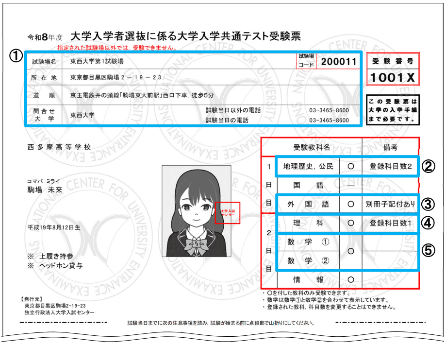受験票の表示内容について、とくに以下の①~⑤は注意して確認しましょう。