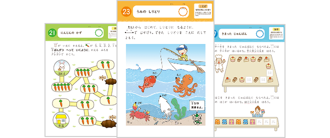 まちがい探しや迷路、文字や数の学習、知識問題、論理問題など、多様な出題で学ぶ意欲を引き出します。1~3月号は年長準備問題も!