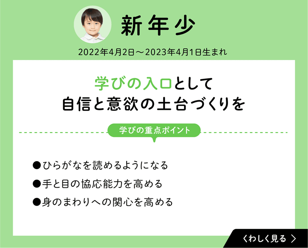 2026年度から年少にも追加!親子一緒に楽しめる、学年に応じた特別な体験型教材です。