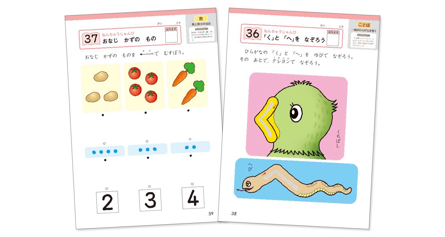 楽しく取り組めて、学びへの意欲を引き出す、年中準備にぴったりなワーク教材です。