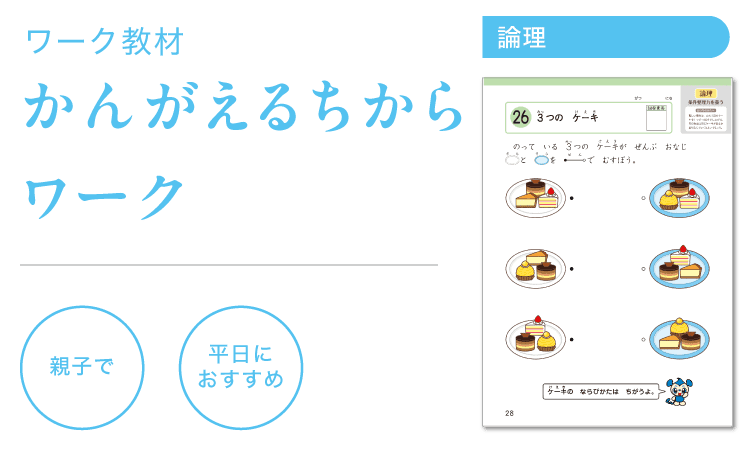 載っている3つのケーキがすべて同じ皿を探し、線で結ぶ問題です。同じケーキが載っているか注意深く違いを見比べることで、形態認知力とともに条件整理力を養います。