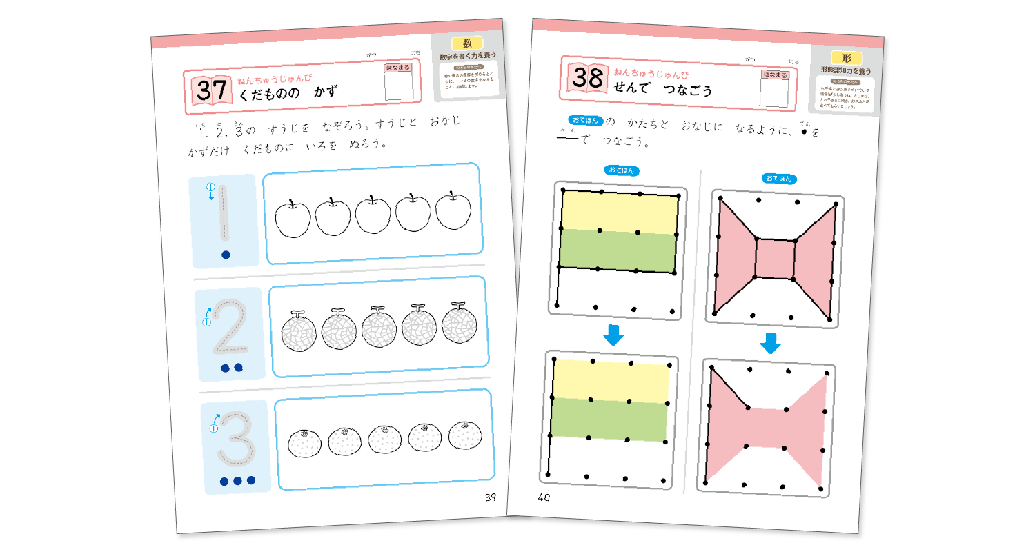 楽しみながら、丸や三角などの基本的な形を繰り返しかくことで、ひらがなを書くために必要な運筆力が身につきます。