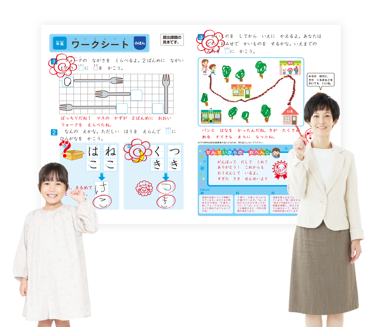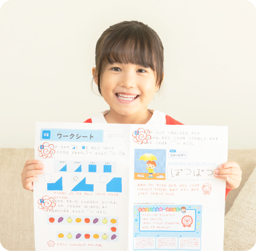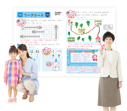 体験型教材のテーマ学習に関連して体験を振り返り理解を深める課題に取り組み、他者に伝える力・表現力を育みます。絵やことばによる表現をとおしてお子さまと担任指導者が会話し、お子さまの頑張ったところや成長の様子を丁寧にお伝えするので、取り組むモチベーションにつながります。