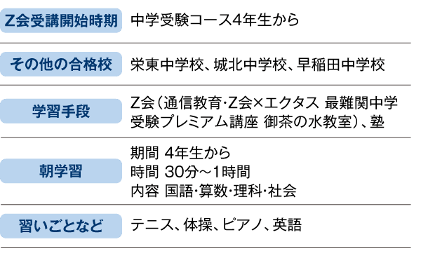 6年生の夏からは、志望校別の演習と開成を目指す子どもたちから刺激を受けることを目的に、日曜日だけ大手受験塾に通い始めました。息子は「Z会のカリキュラムを受験勉強のベースにしたい」、「週に何回も塾へ行くのは時間がもったいない」と言い、Z会中心の受験勉強を貫きました。