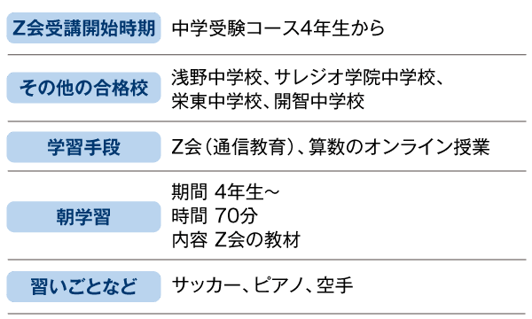 受験勉強を始めた当初より気に入っていた学校が別にあり、⽂化祭や説明会だけでなく部活体験もして、その学校を第⼀志望としてずっと考えていました。ただ、Z会のオンライン保護者会で、志望校に受かるためにはもう一段上のレベルの学校をめざして勉強したほうがいいと聞き、5年生の秋に志望校について再検討することにしました。