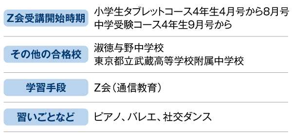 ときには「本当にこれで大丈夫かな」と迷うこともありましたが、Z会で学習を進めたおかげで、「自由な時間が欲しい、習いごとも続けたい」という娘の希望を満たしつつ、女子学院に受かるほどの実力もついたので、これからZ会で受験に臨む方は、お子さんとZ会を信じて頑張ってください。