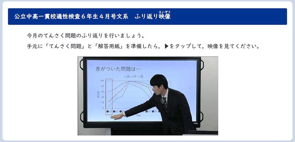 てんさく問題の内容をさらに深く理解できる「ふり返り映像」を配信。映像では、てんさく問題の中から差がつく問題をピックアップし、得点力を高めるためのアドバイスを紹介します。問題で問われているポイントや、解き方のコツなどを確認することで、適性検査特有の解き方を習得していきます。