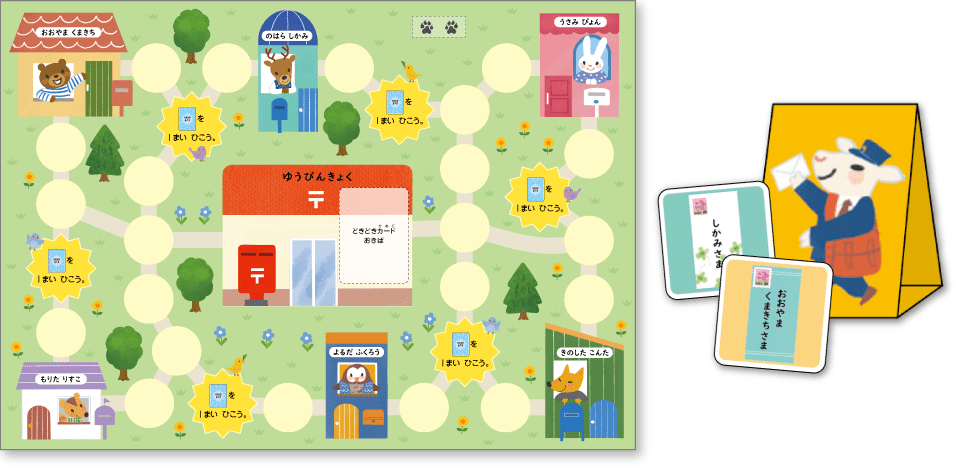 手紙(カード)をすべて配達して、郵便局に戻ると勝ちのすごろくゲーム。効率のよい配達経路を考えながらゴールをめざすことで、先を見通し、論理的に考える力を養います。