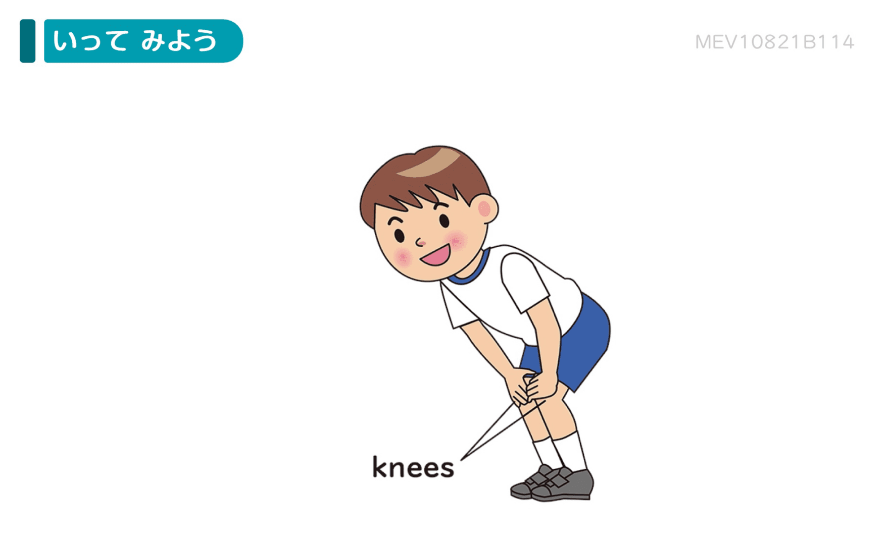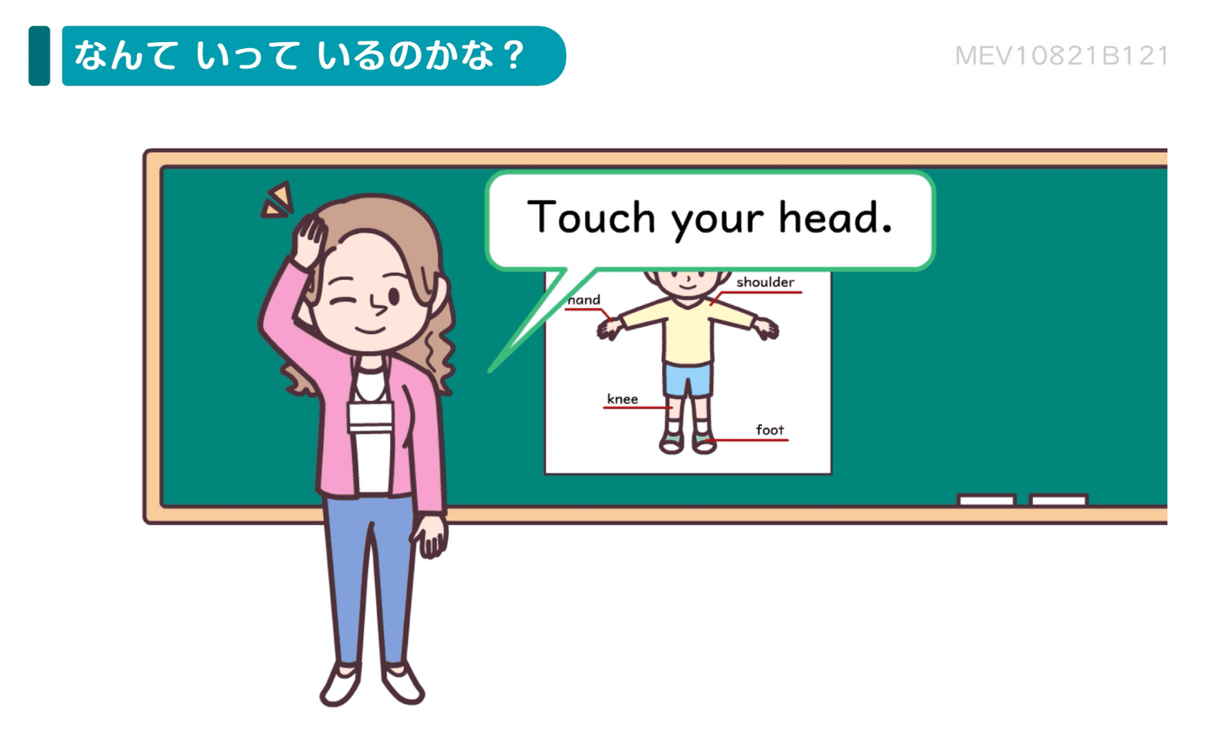 また、今月は体の部位に注目して学習していきます。head「頭」、eye「目」などの基本的なものから、knees「ひざ」、toes「つま先」などのちょっと珍しいものまで、いろいろな単語が登場します。また、Touch your head.「頭を触って。」という表現も学習します。体を動かしながら学習し、楽しく身につけていきましょう。