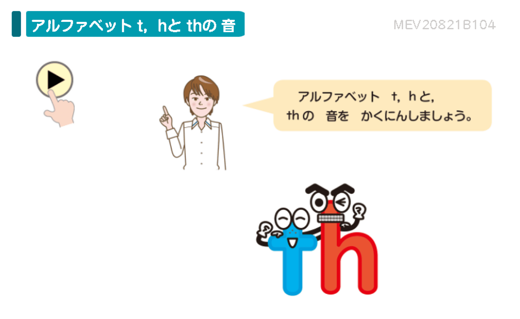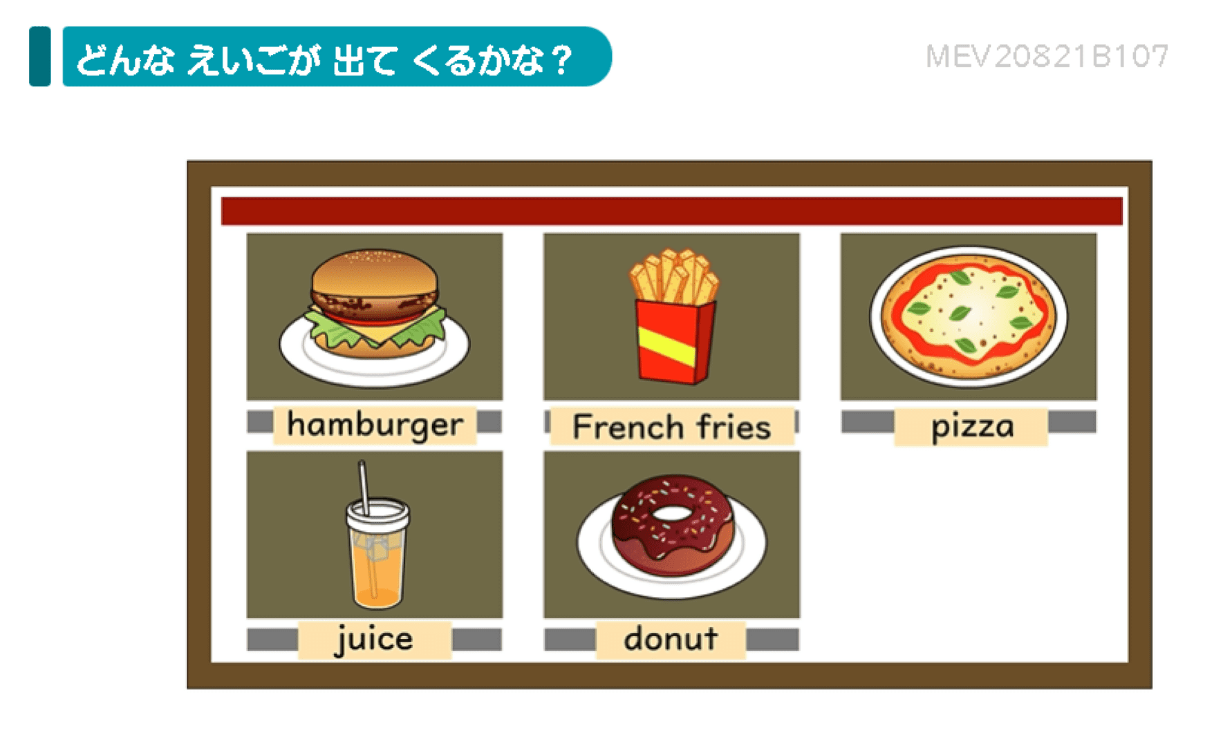 アルファベットのコーナーでは、threeなどに登場する、tとhが並んだときの「th」の音を学習します。具体的な発音の仕方をアニメーション内で紹介していますので、音をよく聞き、発音をまねしてみましょう。中学年以降の学習でもthの音について学習をしますので、お手本と同じ音がすぐに出なくても問題ありません。1・2年生のうちは、英語には日本語にはない音があることに気づき、アニメーションやチャンツでその音に親しんでいただければ十分です。また、今月は「ファストフード店」の場面を取り上げ、お店で注文をするときの表現や具体的な食べ物の名前を表す単語などを学習します。ふだんカタカナ語として使っている「ハンバーガー」や「ピザ」を、英語ではどう発音するのか、日本語との違いに注目しながら取り組んでみてください。