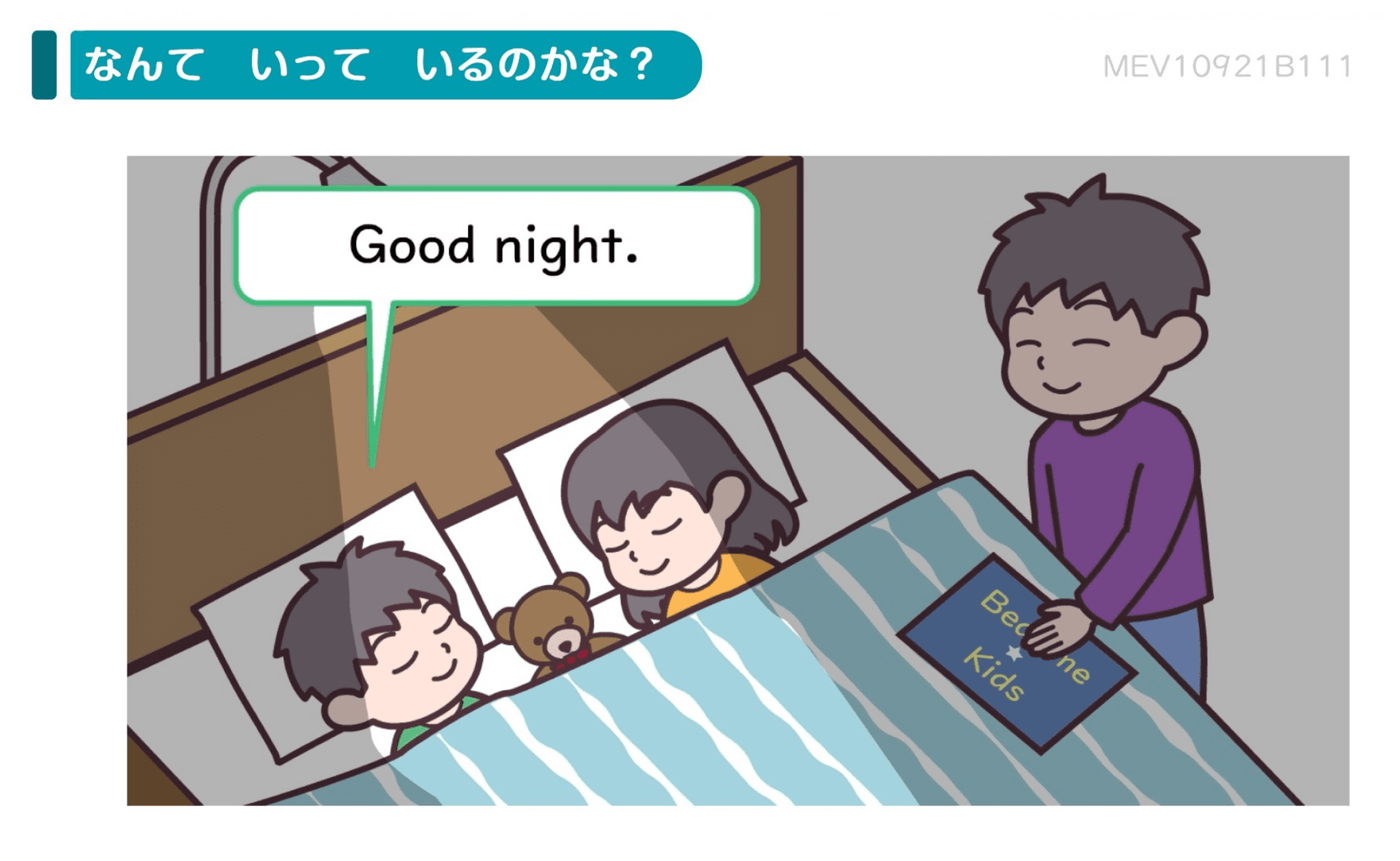 今月の「あいさつ」では、「眠いよ。」「おやすみなさい。」といった夜寝る前に使う表現を学びます。Good night. 「おやすみなさい。」Sleep tight.「よく眠ってね。」など短い英語なので、ぜひ、夜寝る前に親子でやり取りしてみてください。