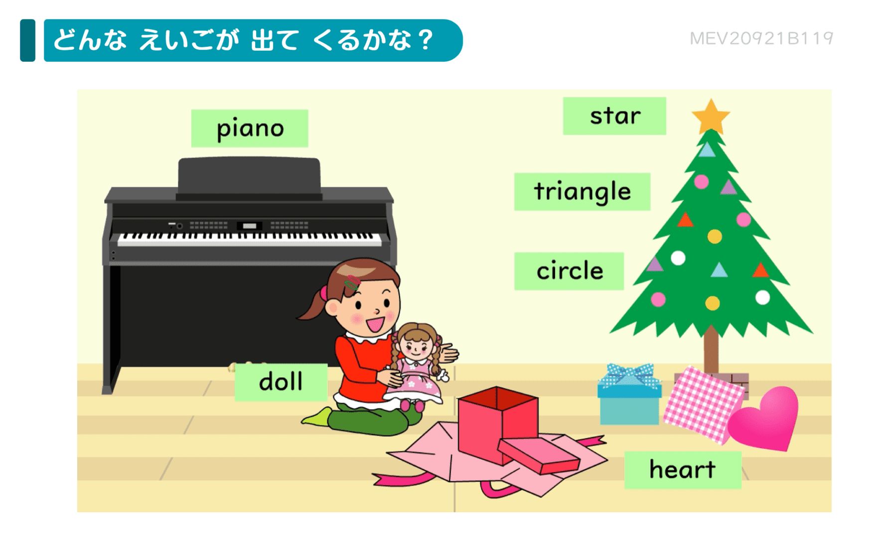 今月は少し長めのクリスマスのお話を英語で見てみましょう。クリスマスに欲しいものをたずねたり、自分がプレゼントに欲しいものを伝えたりする表現のほか、これまでに学習したいろいろな表現が登場します。お子さまと一緒にクリスマスのわくわく感を味わいながら、新しい表現や異文化に触れてみてください。