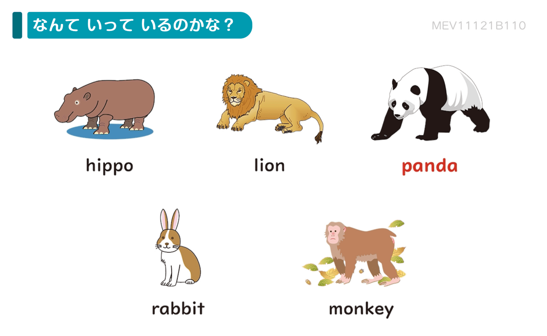 What is it? -It’s a ○○.という応答文は様々な場面で使える便利な表現です。今回は動物の名前を当てるという場面のなかで自然にやり取りを身につけていきます。学習した表現を使って、アニメーションに登場する動物当てゲームにぜひ親子で取り組んでみてください。