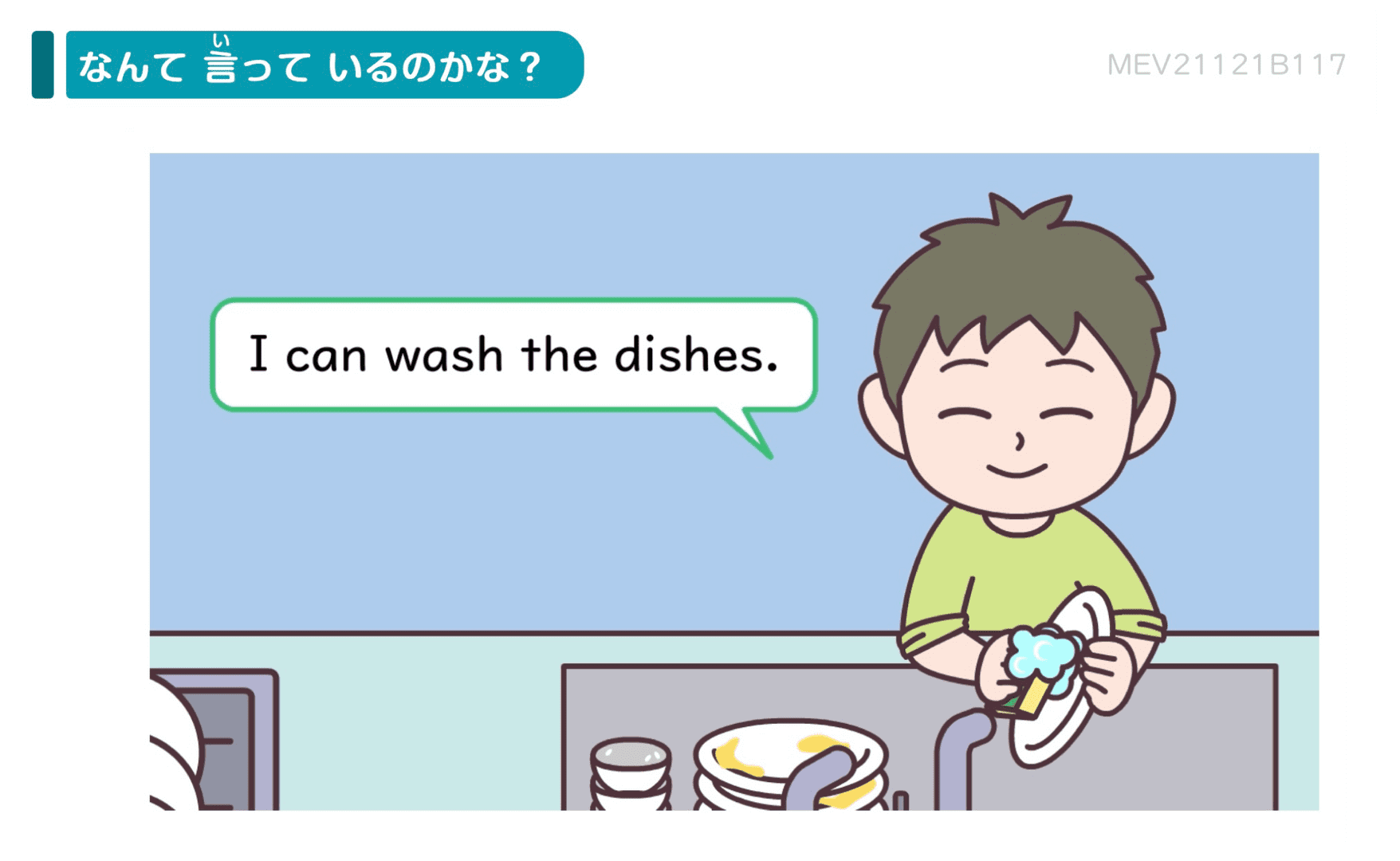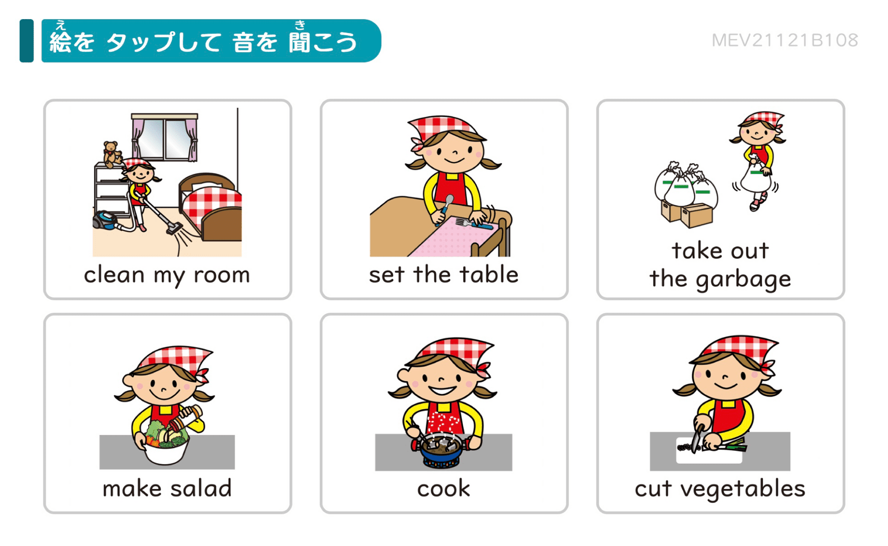 今月はおうちでのお手伝いの場面で使う表現を学習します。助動詞のcanや、動詞を使った表現を少しずつ学んでいきますが、身近な場面から意味を理解できるように設計していますので、難しいことはありません。文法事項にはとらわれずに、家事を表す表現、お手伝いを申し出る表現としてまるごと覚えていきましょう。