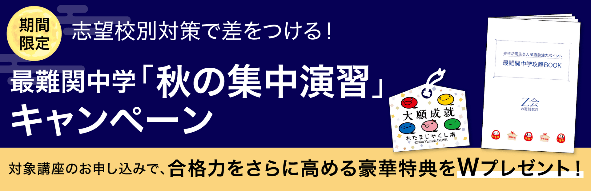 筑波大附属駒場、開成、桜蔭、灘、甲陽学院、神戸女学院の6校の志望者向けに、受験に必要な教科をセットにして提供する講座です。徹底した過去問分析に基づく全3回の「入試予想問題」で本番さながらの演習に取り組み、詳しく丁寧な添削指導を受けて埋めておくべき穴を発見・攻略。志望校への入試対策を万全にします。くわしくはこちらをご覧ください。