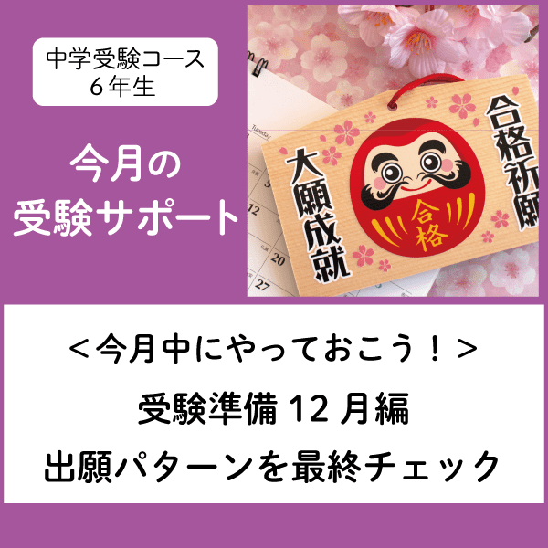 6年生コース最後の1月号の教材は、入試本番までにすべての教材をお届けするために、12月上旬にお送りします。学習サイクルが短くなり、スケジュールどおりに進まないときは、取り組みが必要な単元を取捨選択しながら進めていきましょう。