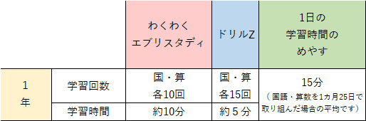 小学生コース1年生は1日あたり15分程度でこなせる学習量です。平日に毎日取り組めば、それほど負担なくこなせる分量です。