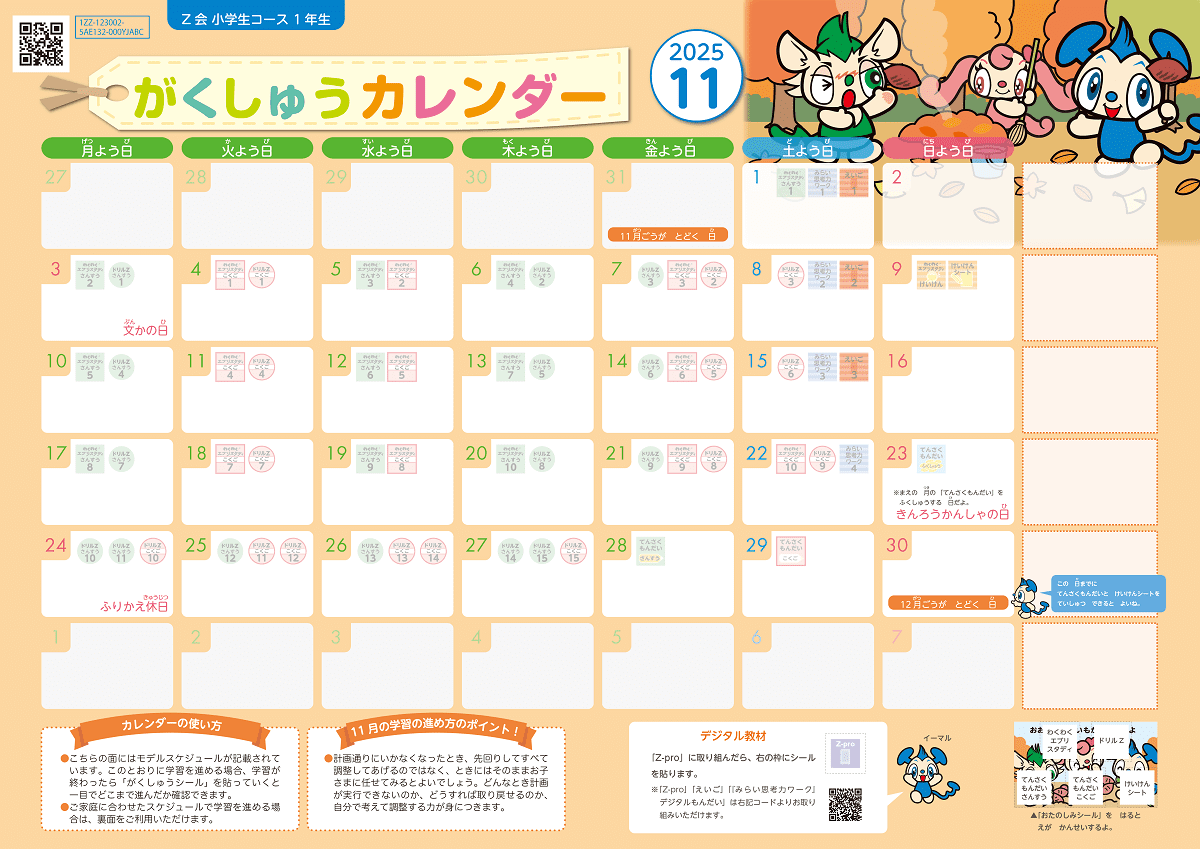 Z会おすすめの「モデルスケジュール」を「がくしゅうカレンダー」に毎月掲載しています。これをベースに、習いごとや学校行事、外出予定などを加味して、お子さま独自の計画を立ててください。