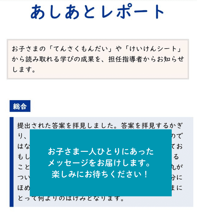 お子さまの答案提出状況などから読み取れる学びの成果、のびている点などについて、国語・算数・経験学習それぞれのご報告や、教科をまたいだ学習全般のアドバイスを担任指導者からお伝えします。