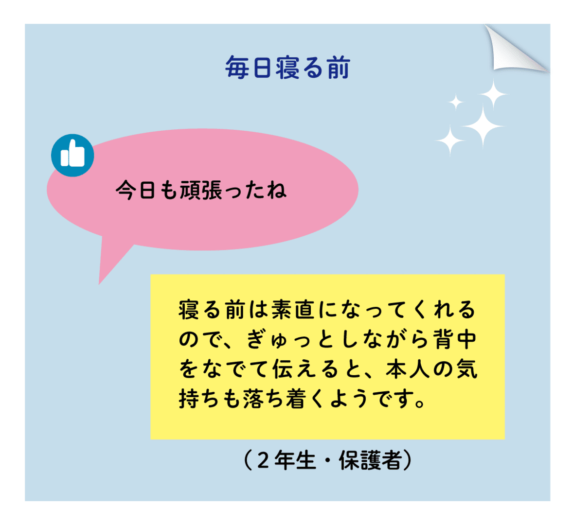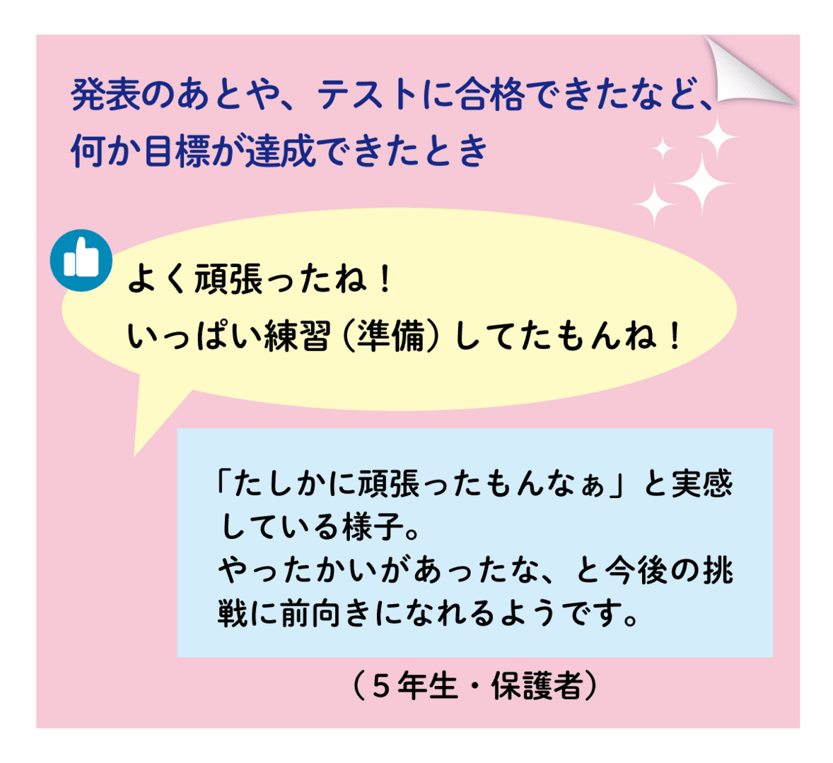 日々の生活のなかで、しかりたくなったとき、どんなふうにほめてあげようかなと思ったときは、この記事を少し思い出して、ヒントにしていただけたらと思います。