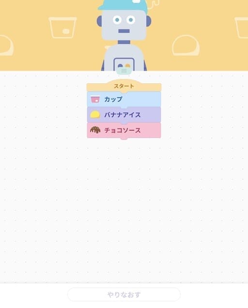 1年生のミッション「まちがいを なおそう」では、注文を受けてからアイスクリームを作るまでの間に起こるまちがいを直すことで、「デバッグ」と呼ばれるバグ(まちがい)を取り除く作業を行います。