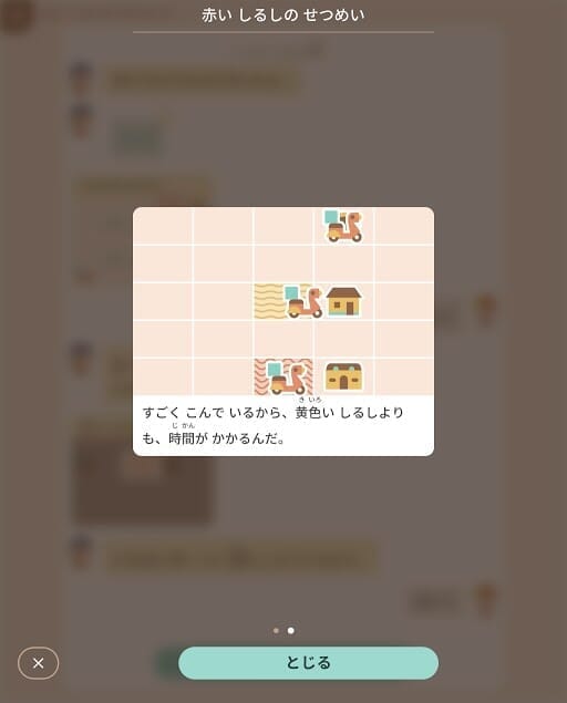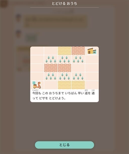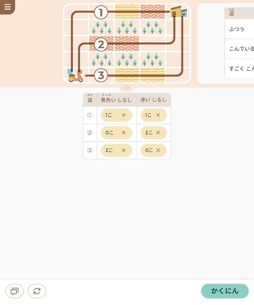 2年生のミッション「はいたつする みちを えらぼう」では、混んでいる道を避けてピザを配達するルートを考える取り組みをします。混んでいる道は変化するため、条件をしっかりと把握したうえで整理し、もっとも適切な道を選びます。