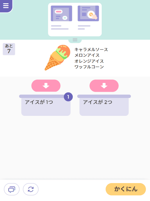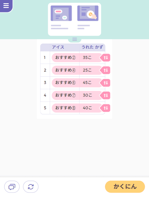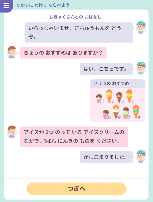 1年生のミッション「じゅんばんに ならべよう」では、お客様の要望に合ったアイスクリームを提案します。たとえば、「アイスが2つで1番人気のものがほしい」という要望に合ったアイスクリームを選ぶ場合、「アイスの数」と「人気のもの(=売れた数)」という2つの軸でアイスクリームをとらえることになります。物事を構造的にとらえて整理しながら考えるという体験を通じて、課題の本質を見抜く力を自然と身につけていきます。