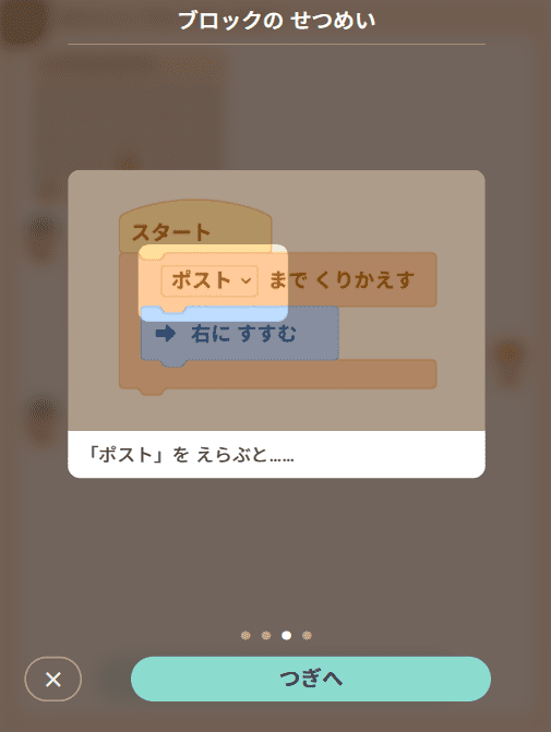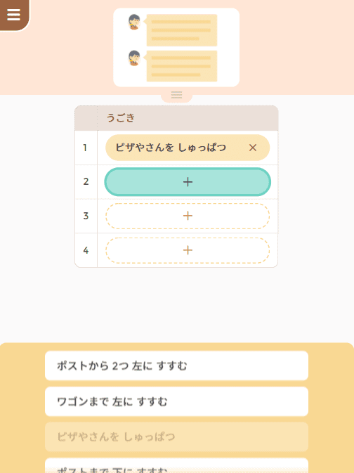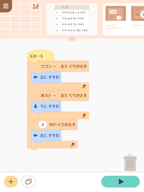 2年生のミッション「目じるしを つかって とどけよう」では、ピザを配達するプログラムを作成します。指定された動きをある条件を満たすまで繰り返す新しいブロックを使ってプログラムを作成し、条件処理の概念を学びます。このブロックを使うことで、目印の場所が変化してもプログラムを変更することなく対応できるというメリットを実感できることでしょう。