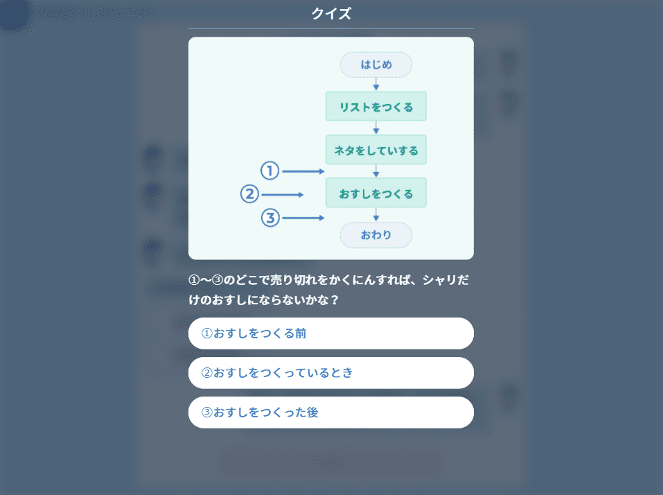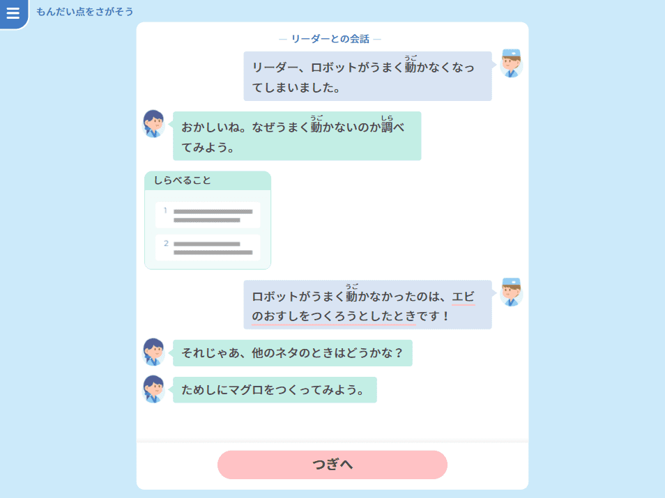 ミッションでは、店員の仕事を通してプログラミングを学んでいきます。お店の種類は学年によって異なります(3年生:おすしやさん 4年生:アイスクリーム屋さん 5年生:ピザ屋さん 6年生:おすし屋さん)。